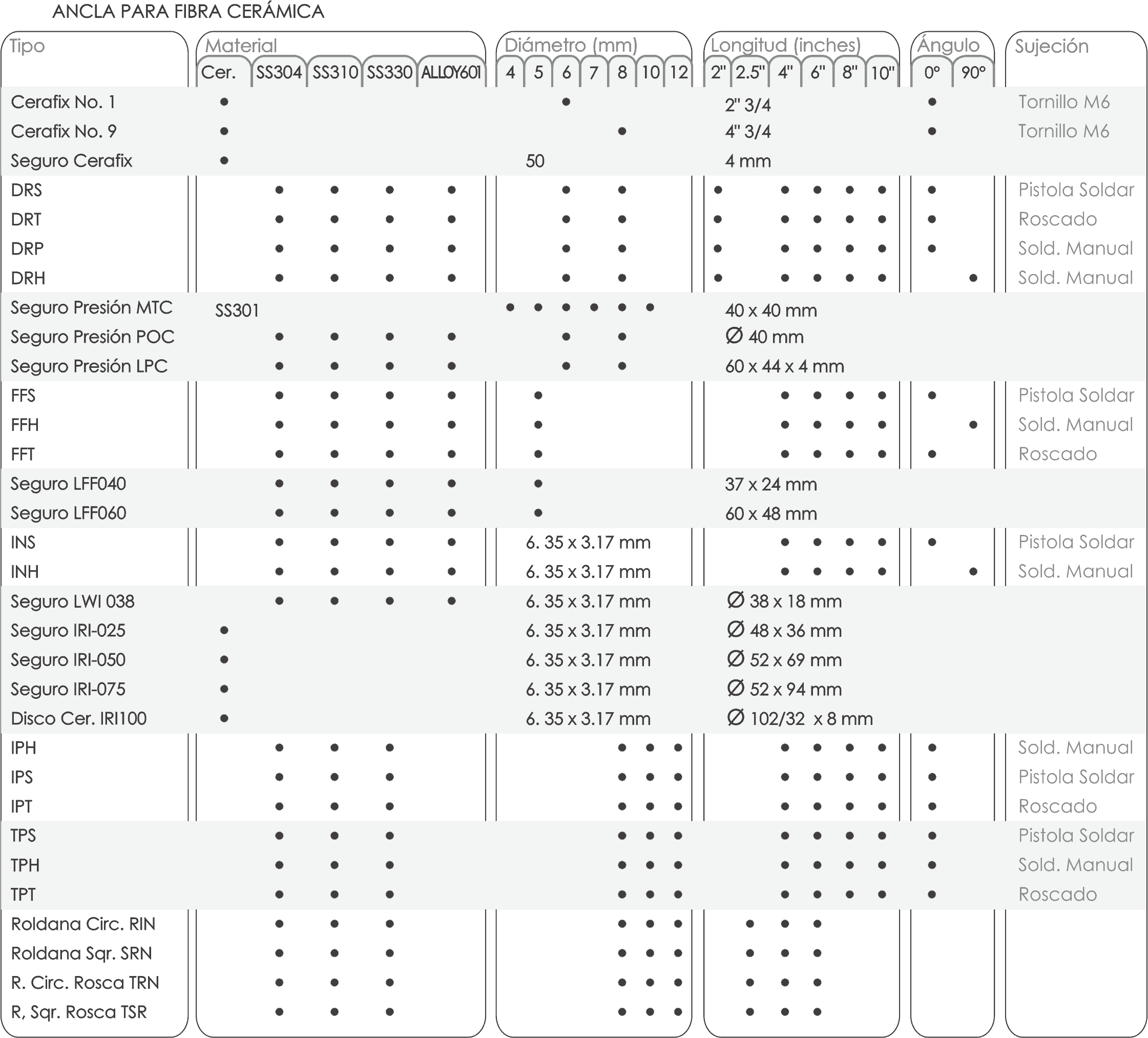 Usted podrá anclar Concretos refractarios y aislantes, Ladrillos, Módulos de fibra cerámica, Telas aislantes, Tableros estructurales, etc.